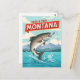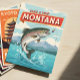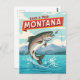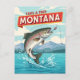 A vintage style illustration shows a large bass leaping from a river with mountains and trees in the background. Text says Take a Trip Montana.