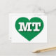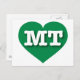This postcard features an eco-friendly vibrant green heart containing the bold, white, upper case letters MT, the official abbreviation for Montana, the treasure state. The reverse side of the postcard is blank, awaiting your personalised text or handwritten sentiments.