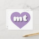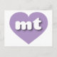 This postcard features a lavender heart containing bold, rounded, white lower case letters mt, a playful abbreviation for Montana, the treasure state. The reverse side of the postcard is blank, awaiting your customised text or handwritten sentiments.