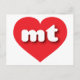 This postcard features a vibrant red heart containing the bold, white, lower case letters mt, a playful abbreviation for Montana, the treasure state. The reverse side of the postcard is blank, awaiting your handwritten sentiments or customised text