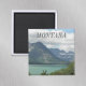 Square fridge magnet that features a scenic photo image of Montana landscape in Glacier National Park that includes the Northern Rockies and a colorful, teal blue lake.