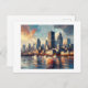 A cityscape is depicted with towering skyscrapers and classical architecture, reflected in a tranquil body of water. The sky is filled with vibrant colors of sunset, adding warmth to the scene.
