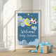 This sweet baby shower design features a night sky, cow and crescent moon.