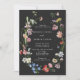 A pretty moody boho wedding invitation featuring an asymmetric horse shoe floral wreath with colourful watercolor Dutch still life flowers on charcoal background. The reverse features a loose pattern of flowers.