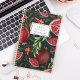 Personalise this planner with your name in dark green italics framed by a white rectangle, on a moody botanical pattern of red pomegranate fruits and green foliage on a dark green background.