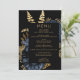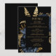 This elegant, moody wedding menu features a lush, romantic floral bouquet in navy blue with gold faux foil and glitter foliage on a black background. Customise the gold-coloured text in stylish fonts on a black rectangle. The back of the card is solid black.