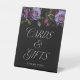 Elegant floral wedding cards and gifts pedestal sign featuring a top border of purple and burgundy flowers with lush green leaves and dark berries. The moody purple floral design is complimented by modern calligraphy typography. Personalise the wedding cards and gifts sign with a short thank you message or custom text. The gothic floral wedding cards and gifts sign is perfect for your fall wedding, bridal shower, baby shower, birthday party, or special event. Designed to coordinate with our Moody Gothic Floral wedding collection.
