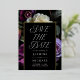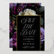 Elegant moody floral wedding save the dates featuring a background of purple, ivory, and burgundy flowers with lush green foliage on a black background. "Save The Date" is displayed in elegant, modern typography. Personalise the purple floral save the dates with your names, wedding date, and location located inside of a gold foil rectangle frame. The design coordinates with our Moody Gothic Floral wedding collection.