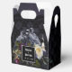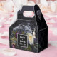 This favour box design is perfect for a modern elegant Gothic wedding. The moody floral design features a natural bouquet of purple and white flowers in a luxurious arrangement on a dark purple and black lace background.