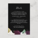 This moody purple black wedding details enclosure card is perfect for a modern wedding. The elegant floral design features dark plum purple and white tulip flowers with emerald green leaves and gold leaf accents.