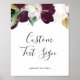 This moody purple blooms cards & gifts custom text sign is perfect for a modern wedding. The elegant floral design features dark plum purple and white tulip flowers with emerald green leaves and gold leaf accents. Customize the wording to say anything you'd like! This sign can be used for cards and gifts, guest book, wedding hashtag, favors, dessert bar -- anything! It can be used for a wedding, bridal shower, rehearsal dinner or any event. The line of text at the bottom of the sign can be personalized with the date, the names of the bride and groom, or a short message like "Thank you". If you would like multiple coordinating signs, customize and add to your cart one at a time.