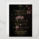 Perfect for a modern wedding, this elegant invitation showcases deep plum tulip blooms and lush emerald green leaves against a rich black background. Luxurious pressed gold foil lettering and accents add a sophisticated touch, creating a moody yet romantic floral design.