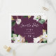 This moody purple blooms plum save the date postcard is perfect for a modern wedding. The elegant floral design features dark plum purple and white tulip flowers with emerald green leaves and gold leaf accents.