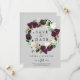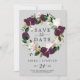 This moody purple grey save the date announcement card is perfect for a modern wedding. The elegant floral design features dark plum purple and white tulip flowers with emerald green leaves and gold leaf accents.