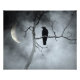 The moody sky tries to hide a crescent moon that glows at night next to a perched raven.