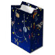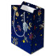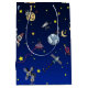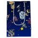 Moon Adventure Gift Bag - Cartoon style illustrations of all sorts of things you might find in outer space-- rocket ships, UFOs, satellites, stars, planets, moon, and earth. Watch your little space explorer's eyes light up when they see their gift wrapped in this adorable Moon Adventure Gift Bag.