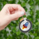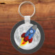 A red, blue and grey catoon rocketship, engines firing, crosses over the moon in dark space.