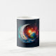 A crescent moon, sun, stars, earth and nebulua adorn this cosmic scene.