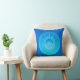 Contemporary celestial mandala pillow pillow in gradients of cerulean blue, turquoise, and aqua, featuring a crescent moon and a burst of stars against concentric circles