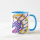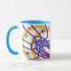 This mug features an ornate complex pattern in shades of blue, magenta and gold. Abstract elemental objects are scattered throughout: suns, moons and curving trajectories.