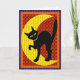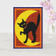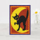 A Halloween greeting card featuring a black cat pracing across the moon. Patterned "quilt" type borders enhance this colorful image.