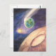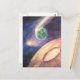 A watercolor painting of a vies of the Earth, shown from just beyond the moon, with a comet shown in the background. A colourful, imaginative and painterly style, with a turqoiuse and grass green Earth, the moon in warm French grey, and a blue-violet and black outer space. I wanted to begin a series of paintings of unique astronomical views. The first ones are of things we are all familiar with, but presented in a new perspective. I did this painting in watercolor and guache.