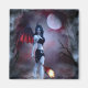 A dark fantasy scene featuring a mysterious, seductive demoness standing beneath a blood-red moon. Her icy blue skin contrasts sharply with her dark hair and crimson bat-like wings, evoking a haunting beauty. Clad in a gothic outfit with tribal markings, she grips a flaming broom, ready to summon otherworldly forces. Twisted trees and a misty night sky surround her, creating an eerie, magical atmosphere.