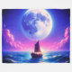 This fleece blanket has a moon and boat pictured on it.