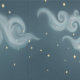 Dreamy depictions of the moon in various phases nestled in swirling clouds.