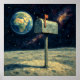 Artwork of a mailbox on the moon. A unique piece that re-imagines the everyday mailbox in an unexpected, otherworldly context. Set on the lunar landscape, with a luminous Earth gazing down and swirling nebulae illuminating the dark sky, this art offers a playful yet profound commentary on connection and distance. The textural details of the moon's surface and the rustic charm of the mailbox contrast with the cosmic grandeur. This is a conversation starter, an invitation to ponder the limits of communication, and a delightful piece of surreal art for any home decor. Its dreamy colours and whimsical concept make its perfect statement piece for those who love science fiction, fantasy, or simply art that stands out from the crowd. Ideal for adding personality and charm to any room. This art can be customised, printed, and or downloaded.