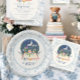 PAPER PLATES AND PARTY DECOR | "A New Chapter Begins!" Storybook, hand painted watercolor on paper, book themed invitations for your Mother-to-be. Celebrate the adventure to come with a beautiful moonlit garden scene flowing out of an open book with butterflies. The outside border has a hand painted toile watercolor line art floral pattern. Art by internationally licensed artist and designer, Audrey Jeanne Roberts ©