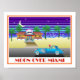 Colourful Art Deco tropical image created in Corel Draw by artist Roanne Baldwin. Features a silver diner, palm trees, crescent moon, flappers and vintage Rolls Royce.