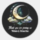 A wonderful and vibrant crescent moon is surrounded by pale grey fluffy clouds; shiny stars and small lunar moons all set against a midnight black background that may be changed to any colour of your choice. Ideal on wedding favour gifts at a moon and stars wedding; for your special starry night themed anniversary or for any wiccan business; lodge or resort.