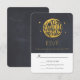 A whimsical wedding RSVP card. Adorable and romantic typography design with a crescent moon and gold stars set on a black chalkboard background. The text says love you to the moon and back, written in a quirky whimsical font.
