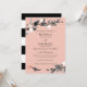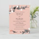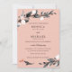 Elegant leaf and flower inspired wedding invitation design featuring a delicate branches of foliage in black, grey and coral set on a pale pink background.