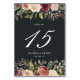 Rustic elegant table number cards feature top and bottom borders of watercolor rose and mom flowers in autumn shades of marsala, burgundy, blush pink, and ivory with green foliage. Your table number, event date and additional custom text appears in the center in white lettering on a rich off-black background. Design repeats on reverse side. Coordinates with our Moonlight Garden elegant floral wedding invitation suite for fall or winter weddings.