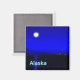 Moonrise in the Inside Passage off the coat of Alaska. Mountains in the distance and a fishing boat heads north. Text reading "Alaska" appears in glowing blue and white.