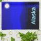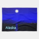 Moonrise in the Inside Passage off the coat of Alaska. Mountains in the distance and a fishing boat heads north. Text reading "Alaska" appears in glowing blue and white.