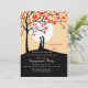 A charming invitation for an engagement. A silhouette couple is featured under a tree with heart-shaped leaves on a hilltop with a full moon.