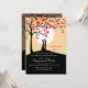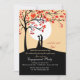 A charming invitation for an engagement. A silhouette couple is featured under a tree with heart-shaped leaves on a hilltop with a full moon.