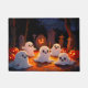 A group of adorable ghosts sitting together on the ground, sharing spooky horror stories. Their playful expressions and eerie atmosphere create a fun, lighthearted Halloween scene.