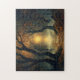 A baroque-style painting of a mysterious forest path bathed in moonlight, where crooked trees arch overhead and mist drifts through the golden autumn leaves.