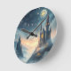 A magical and enchanting scene of a grand castle perched atop a misty mountain peak under a starlit night sky. A large, luminous moon dominates the sky, adorned with a radiant starburst. Sparkling celestial bodies and swirling cosmic dust fill the dark expanse above soft, ethereal clouds that blanket the landscape below. The castle features tall spires, glowing windows, and intricate architectural details, illuminated by the moonlight and hints of internal light. Jagged rock formations rise in the foreground, adding to the mystical atmosphere of this fantastical realm.