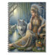 Under the tranquil glow of the moonlight, a serene woman rests by a forest stream, her elegant posture exuding contemplation. Adorned with an ornate headdress and finery that echoes the forests own intricate patterns, she shares a silent communion with a majestic grey wolf. In the background, the shadows of wolves meld with the twilight-draped trees, creating a harmonious fusion of wild spirit and peaceful reverie.