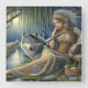 Under the tranquil glow of the moonlight, a serene woman rests by a forest stream, her elegant posture exuding contemplation. Adorned with an ornate headdress and finery that echoes the forests own intricate patterns, she shares a silent communion with a majestic grey wolf. In the background, the shadows of wolves meld with the twilight-draped trees, creating a harmonious fusion of wild spirit and peaceful reverie.