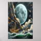 A lone fisherman casts his line under the glow of a large moon, nestled between towering cliffs. A small sailboat is anchored nearby, with waves gently crashing around it. The scene is surreal and ethereal, with a dreamlike quality.