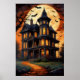 Summon the essence of Halloween with a captivating digital art poster. Behold a towering haunted mansion, its grandeur cloaked in an eerie aura. The massive moon casts its luminous gaze, while bats spiral through the night sky, weaving an enchanting spell. Immerse yourself in the spooky vibes of this masterpiece that captures the very spirit of Halloween.