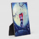 A gothic, doll-like girl with fiery red pigtails stands on a surreal hilltop under a glowing full moon. Dressed in a dark outfit adorned with skulls and clutching a stitched-up bunny, she’s surrounded by whimsical, black-and-white striped tentacles that twist through a star-speckled night sky.