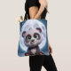 "A tiny, adorable panda stands in front of a majestic full moon, surrounded by a twinkling night sky. The panda's soft pink-grey fur and big green eyes shine with a gentle light, as if they're basking in the magic of the moon."