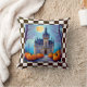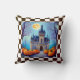 Moonlit Pumpkins Fall Throw Pillow - Charming castle decorated for fall with pretty pumpkins and a warm moon glow. Colours blue, grey, burnt orange, black and white check pattern.